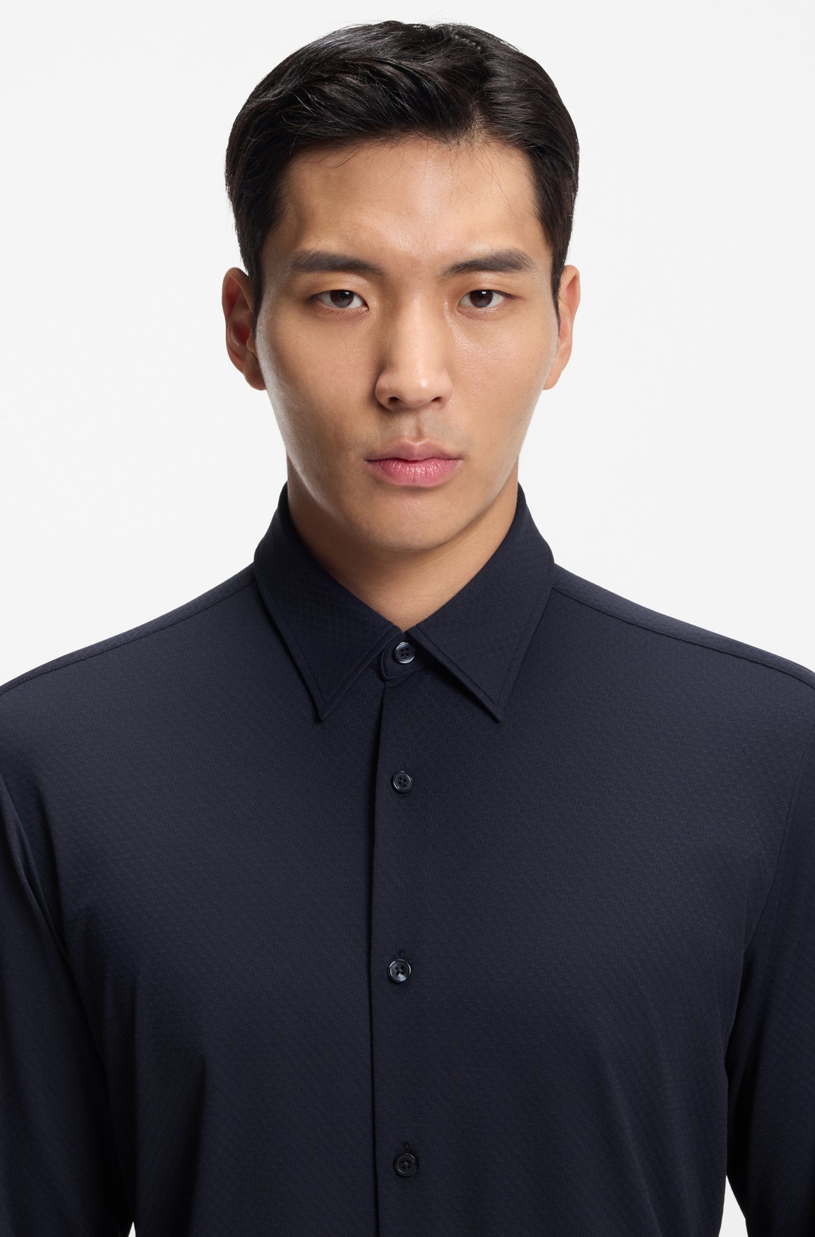 Ponga al día sus básicos business con esta camisa BOSS Hombre con un sutil estampado tonal. Diseño slim fit en punto extraflexible.