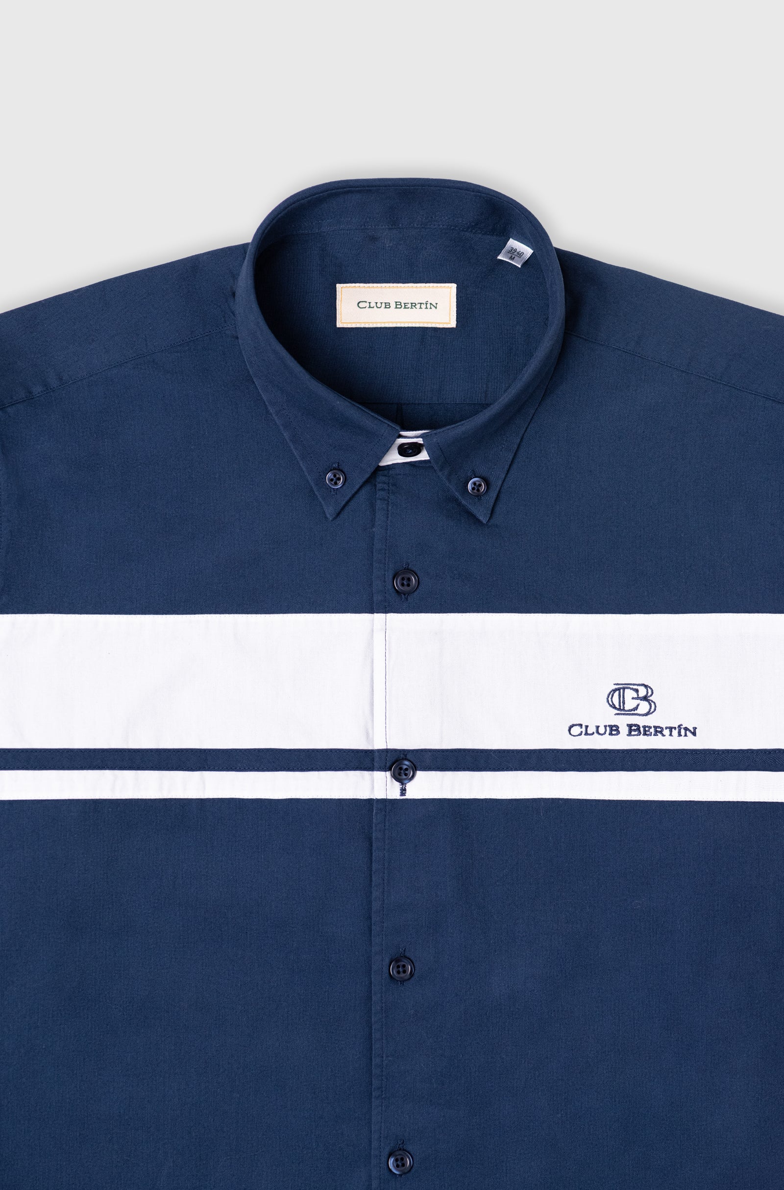 Su corte regular brinda un ajuste equilibrado que favorece la silueta sin sacrificar comodidad. El cuello Kent con botones mantiene una estructura impecable, perfecta para llevar sola o bajo un saco. Como detalle distintivo, incorpora un parche vertical en el pecho, acompañado del logo de Club Bertín finamente bordado en el borde izquierdo, reflejando el carácter y la tradición de la marca.