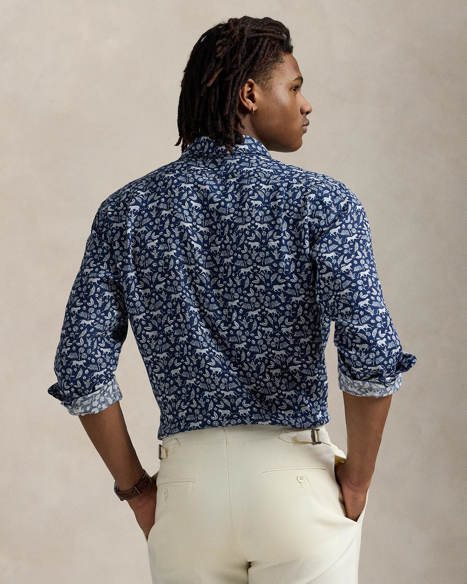 En lino ultraligero, esta camisa está estampada con un motivo a pequeña escala de hojas de palmera y jaguares.