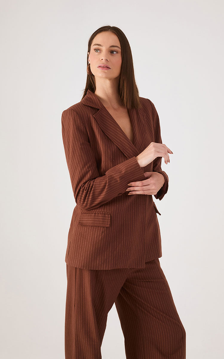 Nuestro blazer de raya diplomática transforma un look básico en uno elaborado, sofisticado y elegante. Presenta un largo alargado, escote en V, cierre frontal con botones forrados y un ajuste impecable.