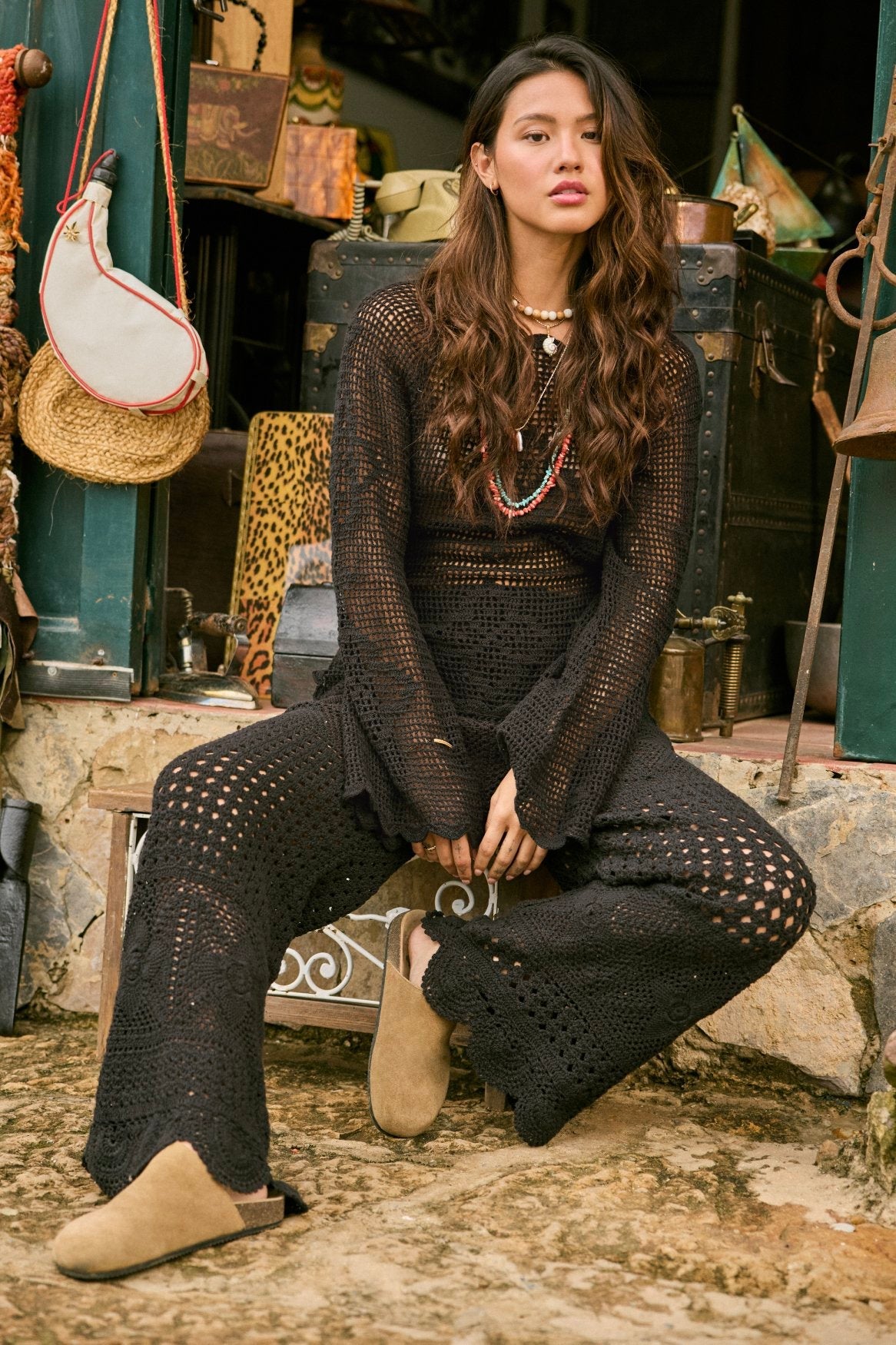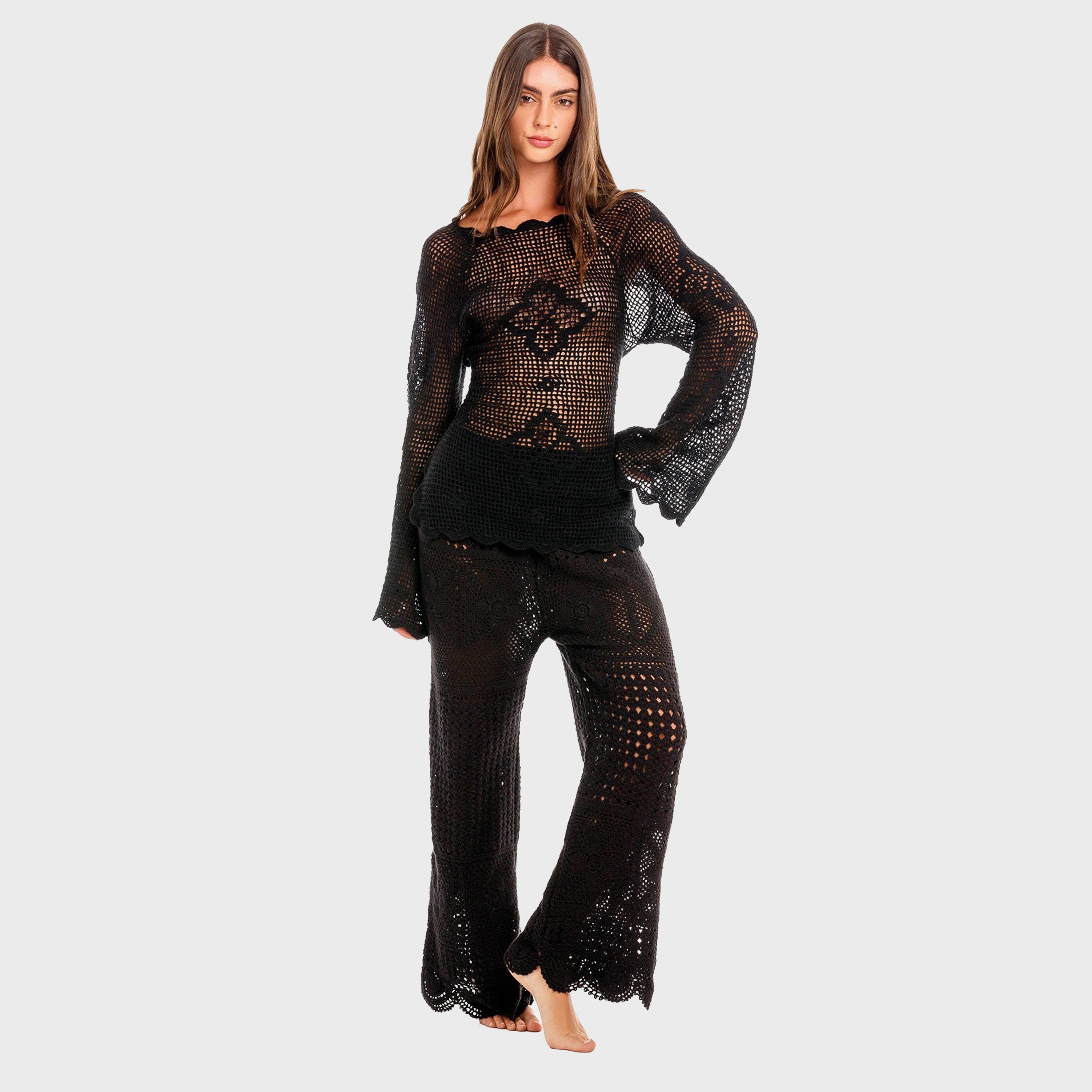 El set Boh en negro es tu prenda ideal para combinar con capas playeras de forma sencilla con un toque atrevido. Confeccionado en tejido de crochet ligero, presenta preciosos detalles de ribete, mangas largas acampanadas y una espalda amplia y abierta que se ata para un ajuste ajustable. Su diseño transparente le da un toque divertido y moderno, haciéndolo perfecto para usar sobre tu bikini favorito o con pantalones a juego para un estilo boho chic y relajado.