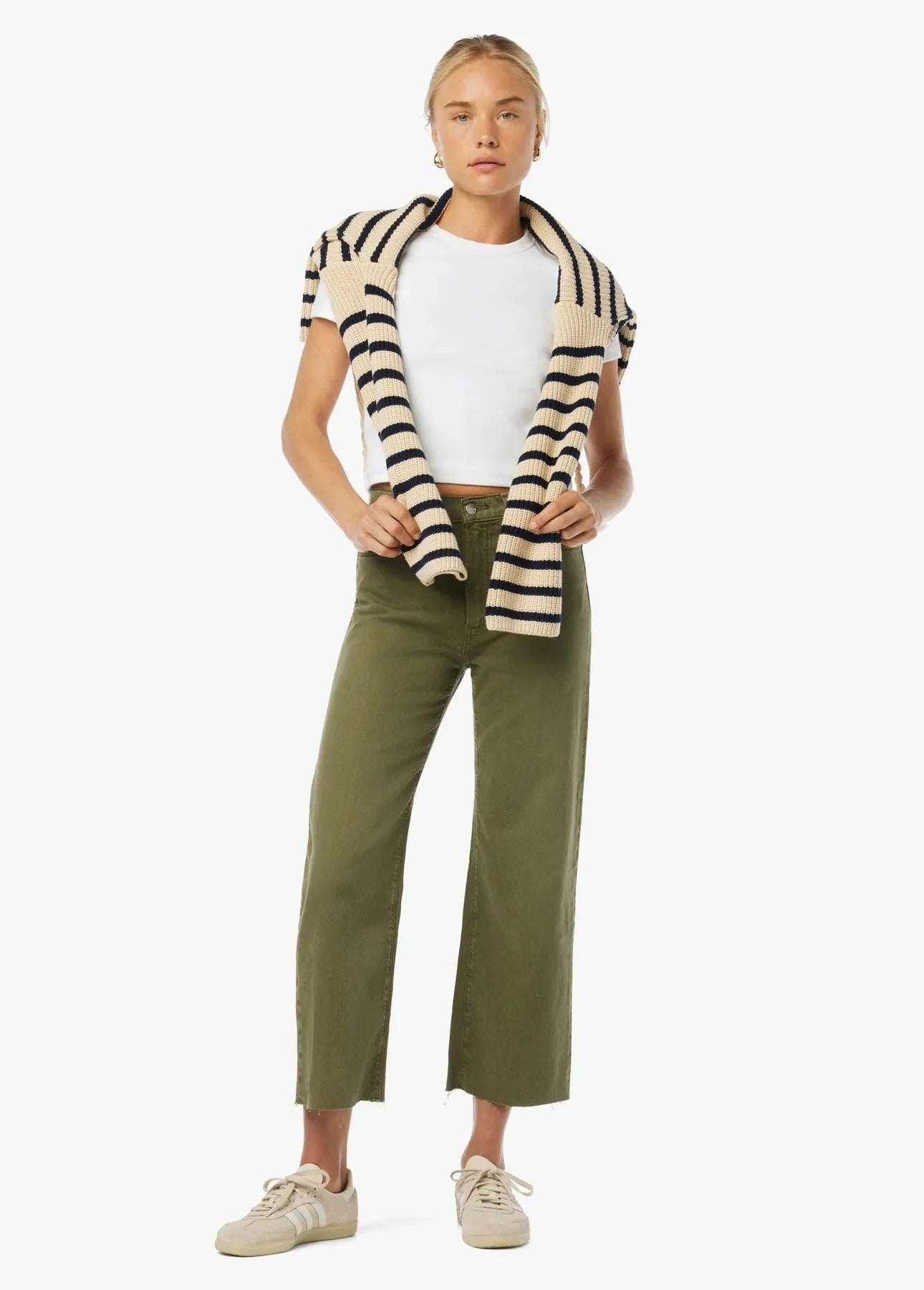 Jean mujer confeccionado en nuestro denim Vintage Stretch, los jeans Blake en Burnt Olive tienen un acabado en un rico tono tierra con dobladillos sin rematar. El estilo de pernera ancha llega hasta la cintura natural antes de caer hasta adquirir una forma holgada y sencilla en las piernas.