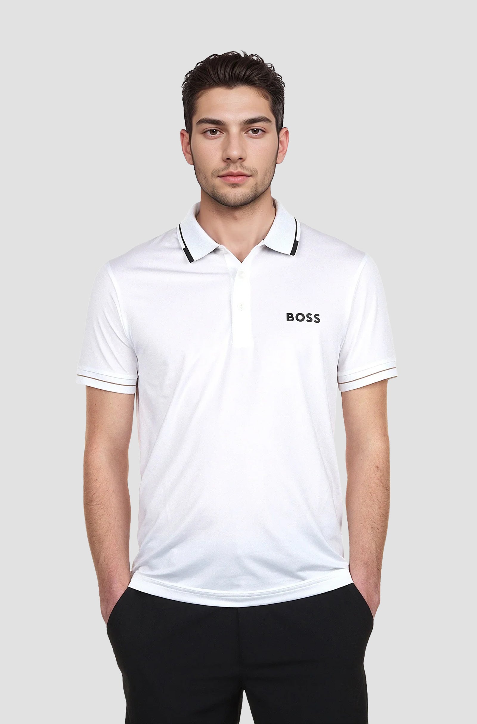 Dale un toque moderno a tu estilo casual deportivo con este polo de BOSS Menswear. Con corte recto, este polo de manga corta está confeccionado en una mezcla de algodón y lino para una sensación fresca y transpirable. El cuello Johnny le da un acabado impecable.