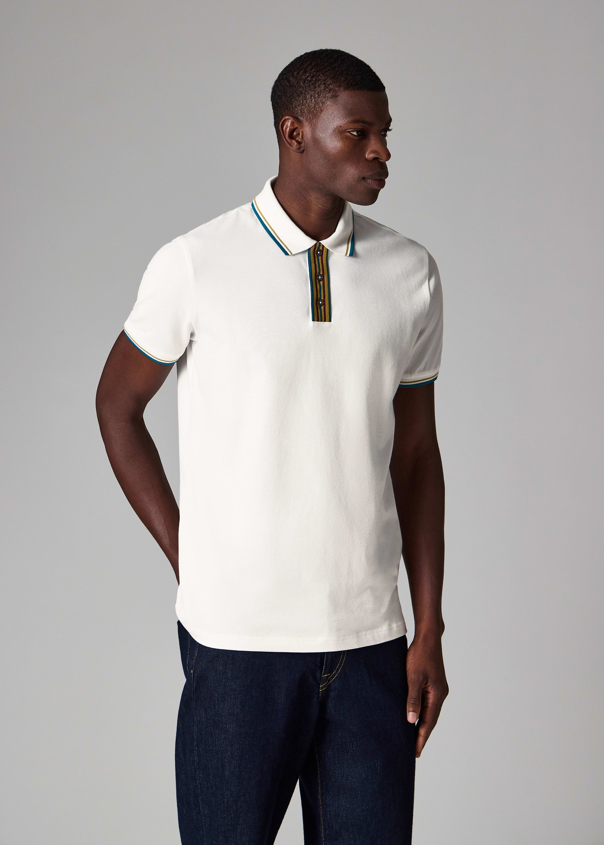 Hecho de algodón orgánico con elasticidad para mayor comodidad, este polo color crudo presenta ribetes de rayas en contraste en la tapeta, el cuello y los puños.