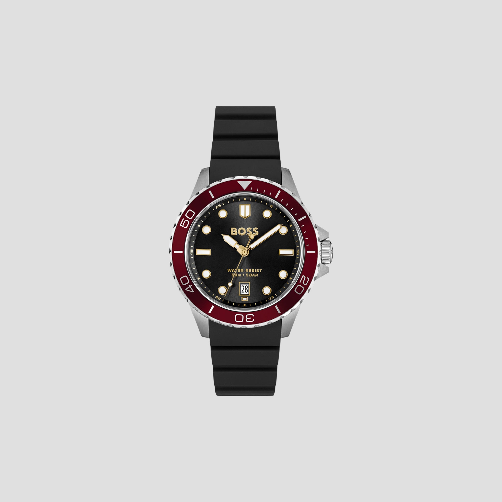Con una esfera negra con efecto rayos de sol, este reloj BOSS para hombre, inspirado en el buceo, presenta un bisel giratorio con una inserción de aluminio en contraste. Correa de silicona negra estructurada.