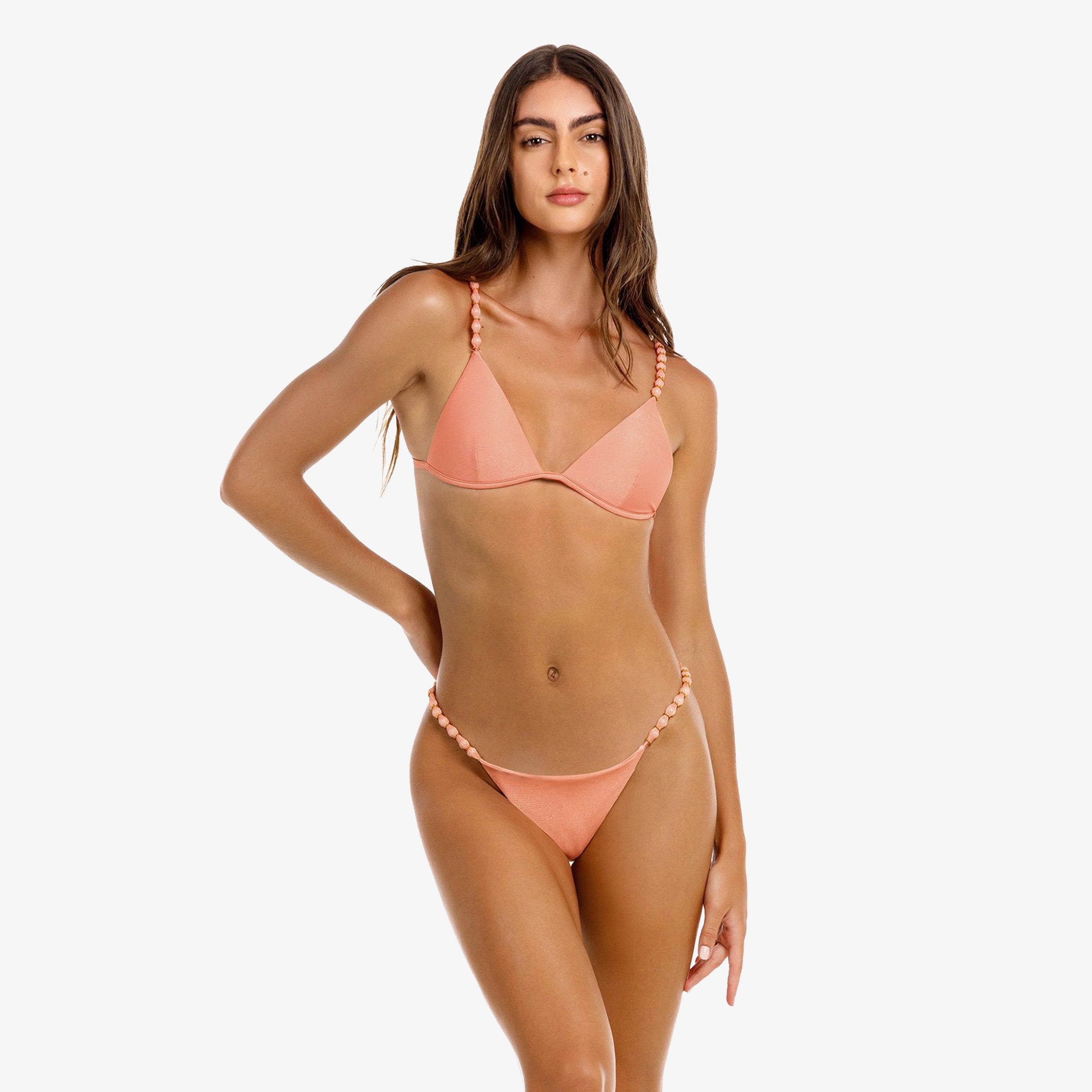 La braguita Dakota ofrece un ajuste elegante y favorecedor con un toque divertido. Su tejido metalizado color melocotón captura la luz con belleza, mientras que los finos tirantes laterales con cuentas le dan un toque divertido. Su cobertura brasileña la hace atrevida y elegante, perfecta para lucir tu brillo veraniego.