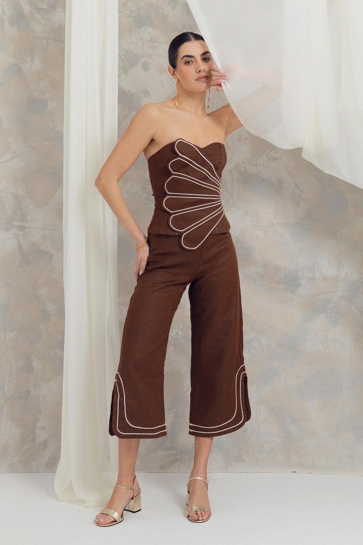 Falda larga en lino rosado con detalle drapeado y broche dorado tipo sol. Feminidad y movimiento en una sola pieza. Diseñada para realzar la silueta con elegancia, esta falda larga en lino combina estructura y movimiento gracias a su corte limpio y su sutil drapeado en la cintura.