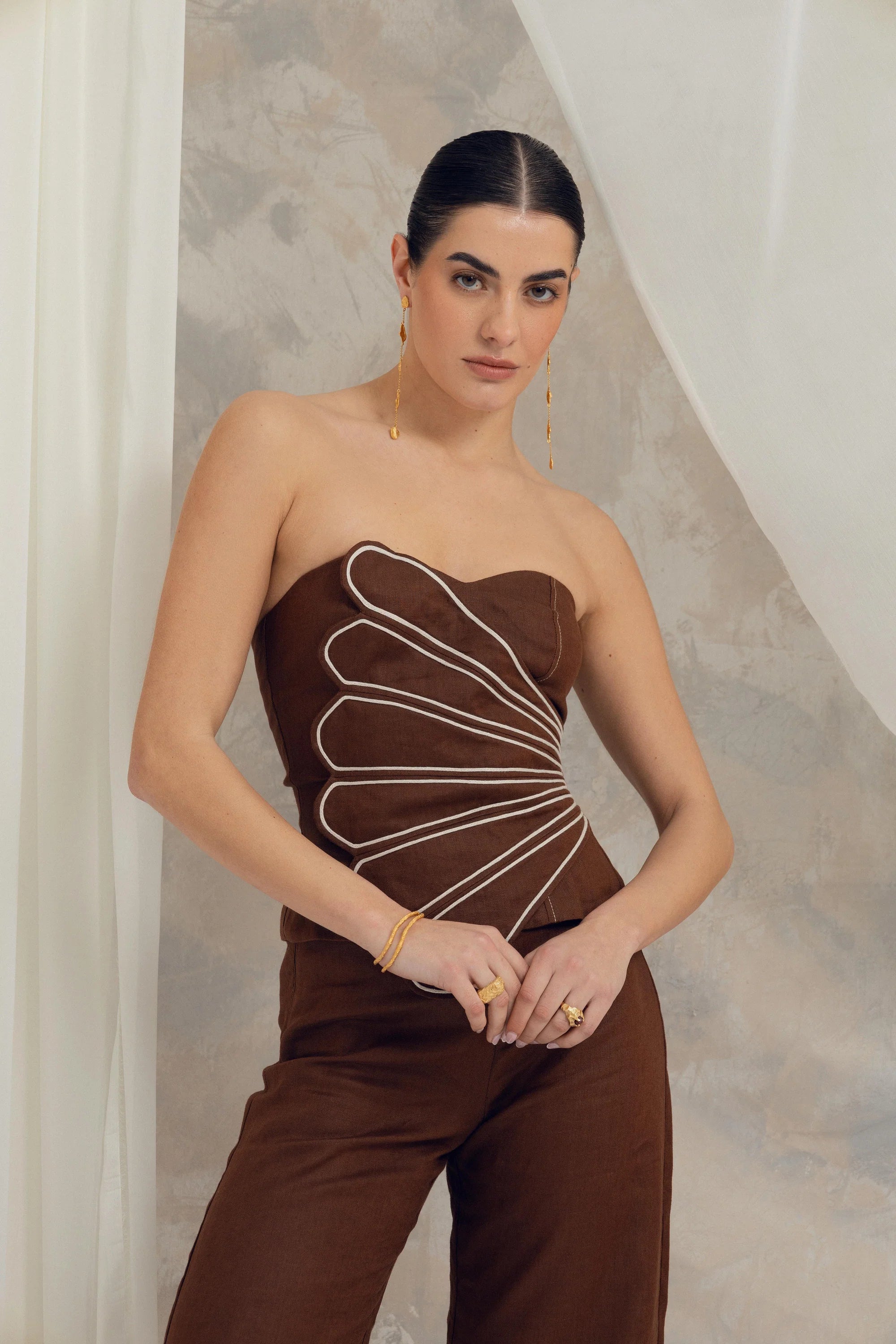 Blusa asimétrica en lino rosado con detalle dorado inspirado en el sol. Elegancia suave y distintiva. Esta blusa en lino 100% natural, en un delicado tono rosado, aporta una silueta escultural con su diseño asimétrico. El detalle protagonista es el broche dorado en forma de sol, que adorna el hombro y le da un aire artístico y sofisticado a la prenda.