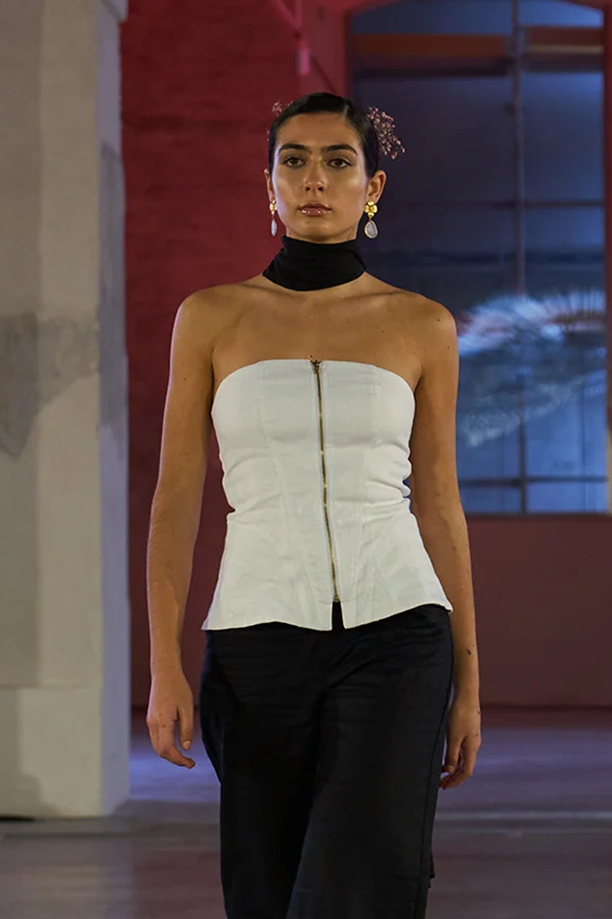 Blusa strapless blanca en lino con cremallera dorada frontal. Atemporal, minimalista y estructurada. Es una pieza statement para tu armario